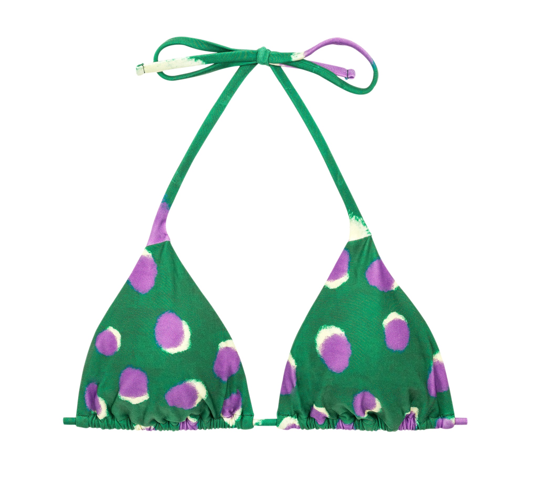 Introducing the Rio de Sol Patterned Triangle Swimwear Top in a vibrant green color. This Brazilian-made top features a removable pad and offers UPF 50+ sun protection.